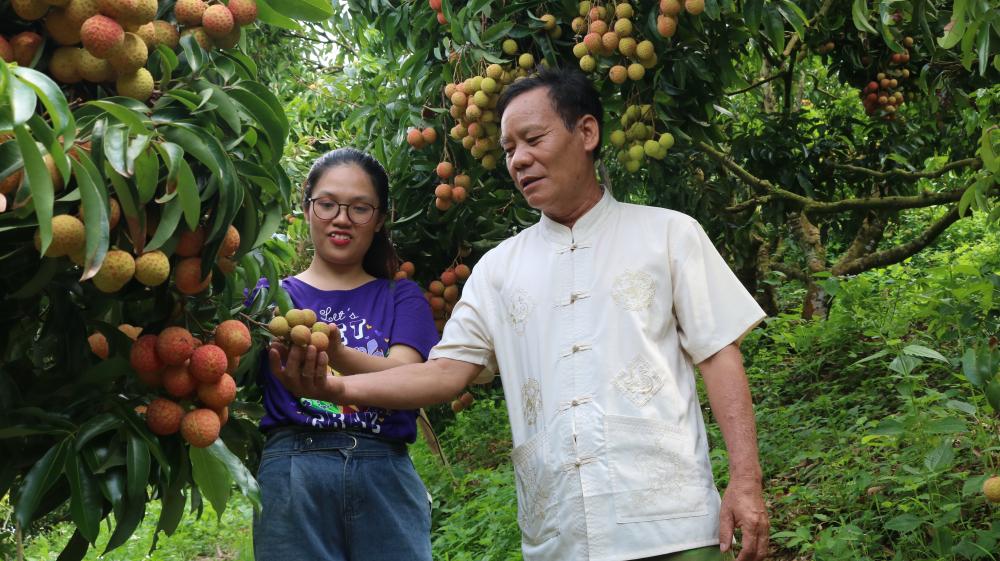 Ông Vi Văn Nhuần thôn Hóa - Tân Sơn - Lục Ngạn vui vẻ vì quả vải trong vườn của gia đình đã bay thành công sang Nhật Bản
